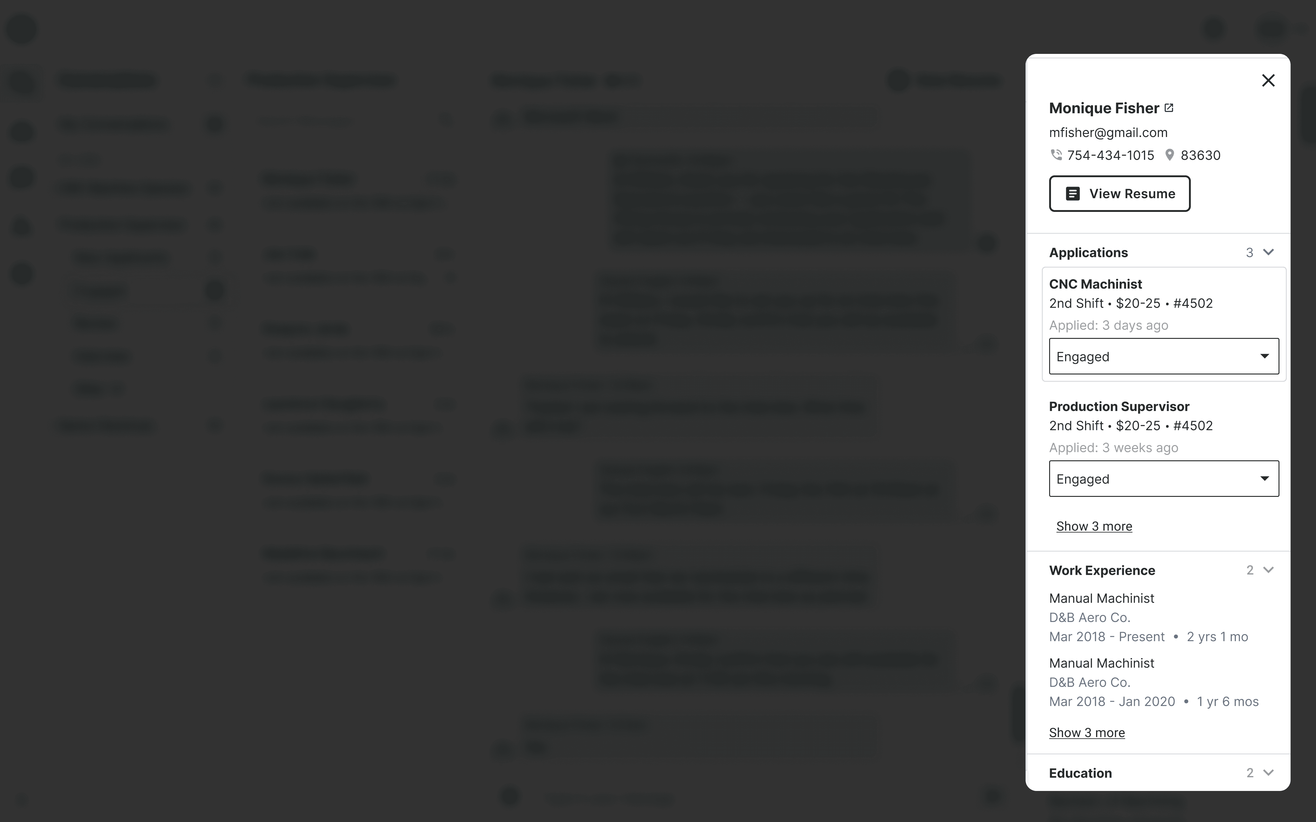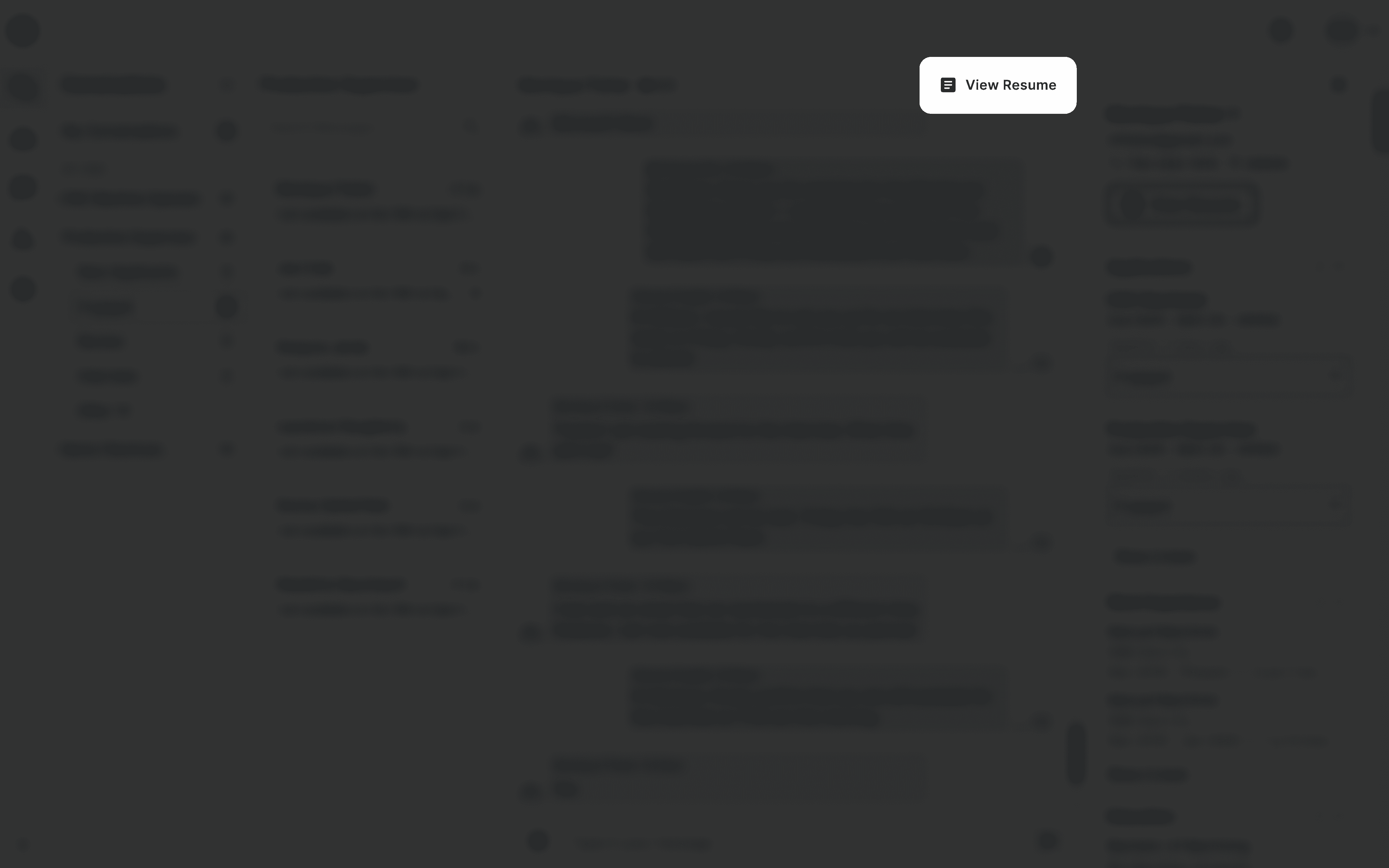 Tabs to view candidate information - Instead of jumping back and forth between different pages (jobs page and messages page), rely on a constrained drawer or use pop-ups to view resumes, users can now select the right tab for candidate to display the desired information.