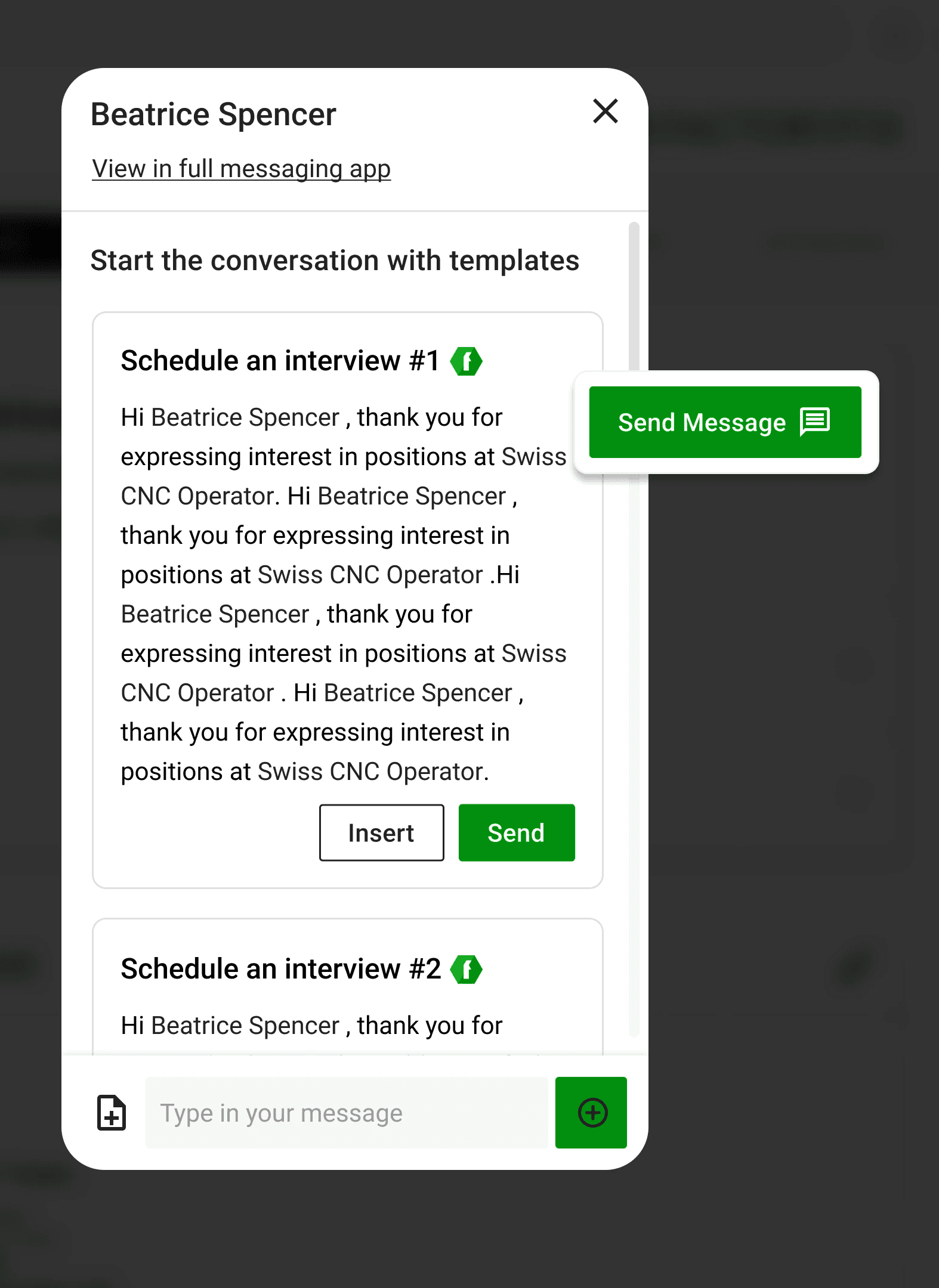 No matter what tab the user switches to, the message box will follow them around. Now the user can review the candidate's application, resume, other applied jobs and more without losing the ability to message them.